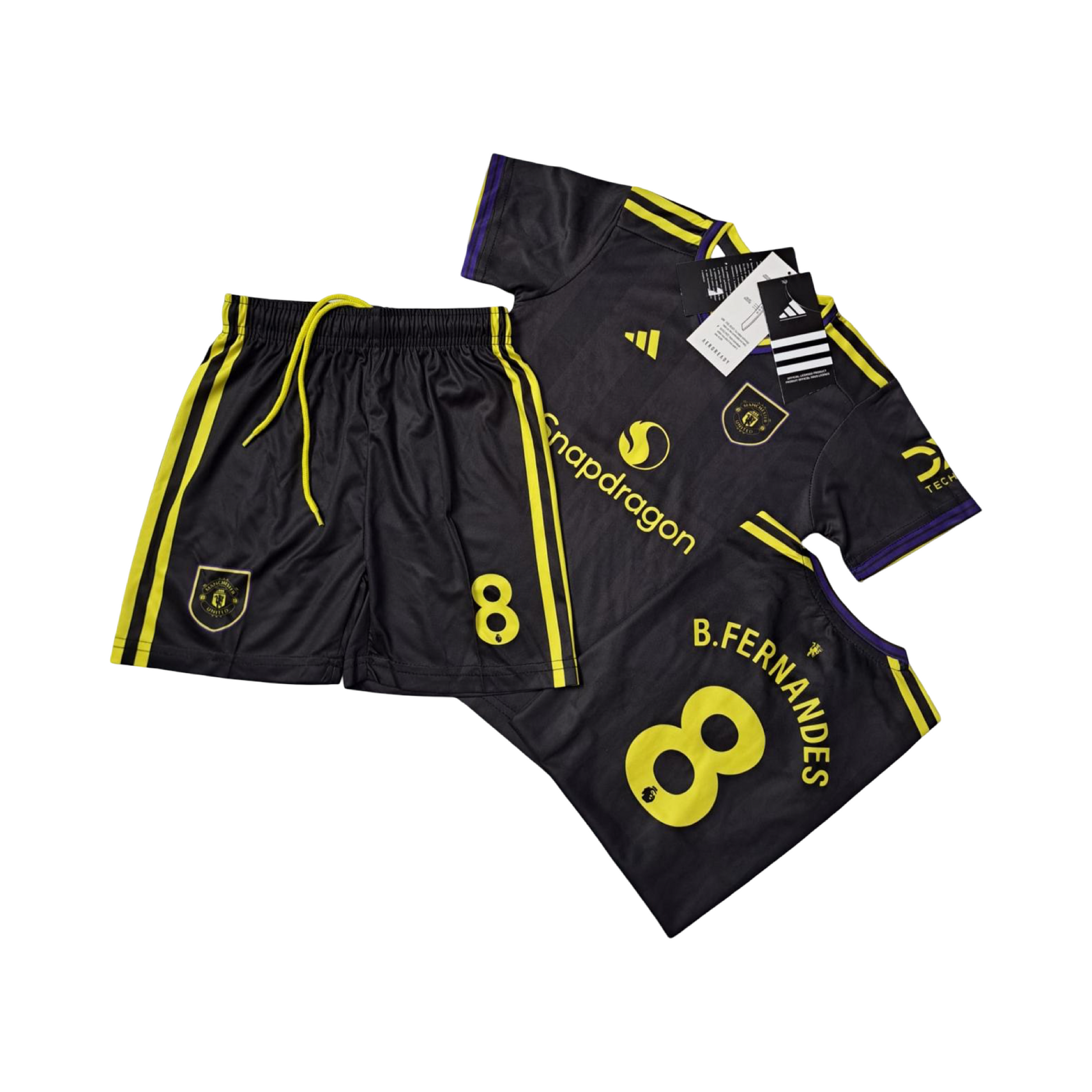 This Manchester United black kids suit is designed with the iconic number 8, worn by midfielder Bruno Fernandes. Made for young fans, this suit offers style and comfort, perfect for supporting the team. Show off your love for Man Utd with this authentic kit.